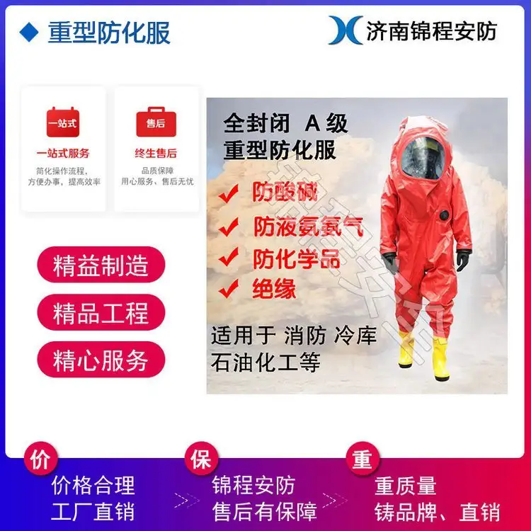 品牌锦程安全功能防酸碱、耐腐蚀、防化学物质侵害、阻燃性能用途范围消防、化工、石油、燃气、军工、冶金、电力重量≤5kg是否连体是尺码M、L、XL、XXL颜色红色材质PVC型号JC-RFH02具体参数:面料耐化学液体渗透性能(80%H2SO4 60%HNO3 30%HCL)60min不渗透防碱渗透性能(6.1mol/LNaOH);60min不渗透阻燃性能:有焰燃烧时间≤2s无焰燃烧时间≤10s损毁长度